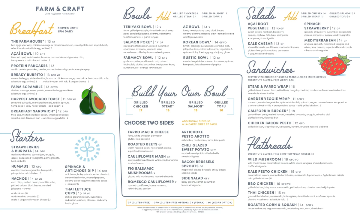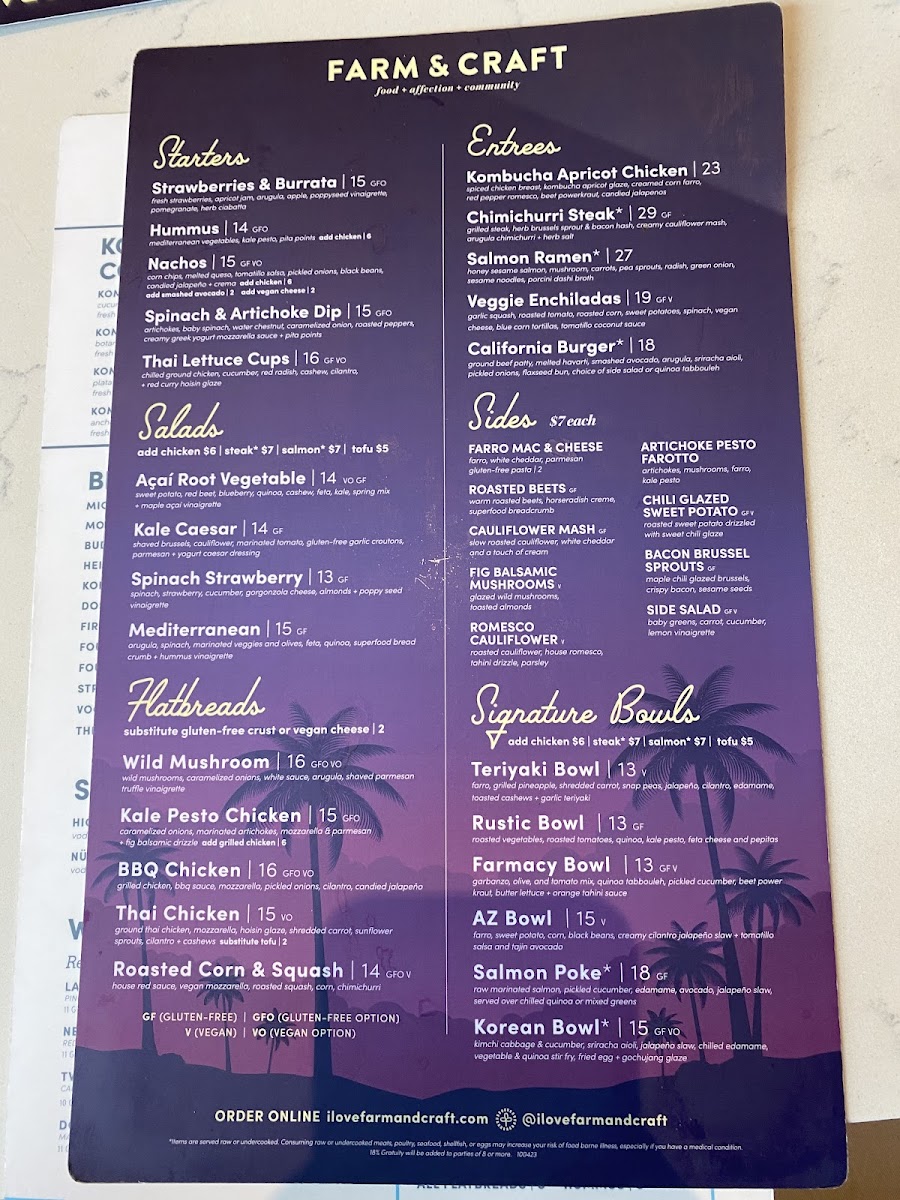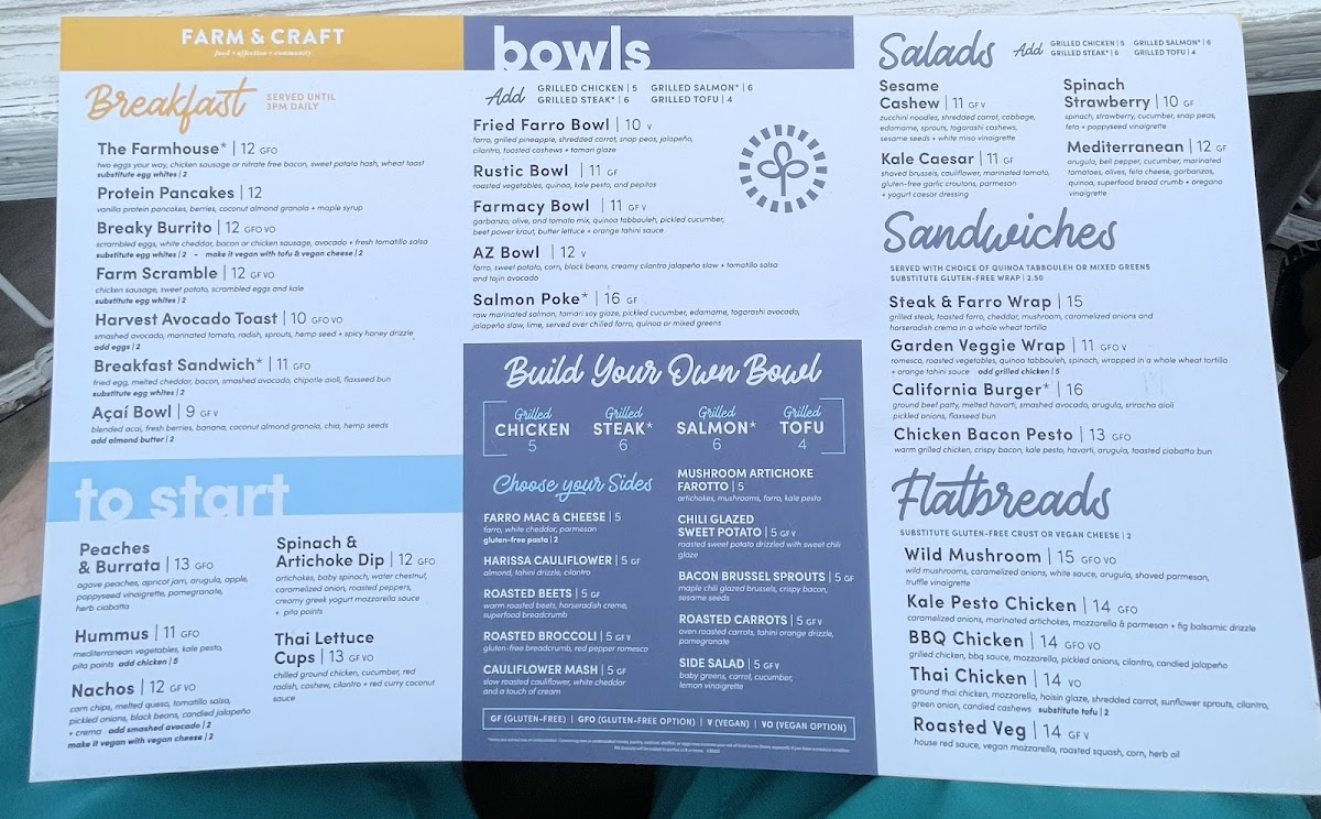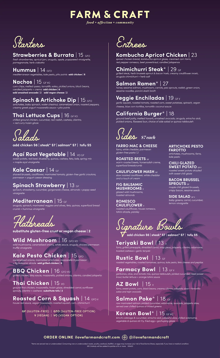 At Farm And Craft Scottsdale Menu, every dish is a celebration of fresh, locally sourced ingredients and a passion for crafting meals that nourish both body and soul. Nestled in the heart of Scottsdale, Arizona, this restaurant offers a delightful selection of farm-to-table creations that highlight the best of seasonal produce and responsibly sourced meats. Whether you're in the mood for a vibrant salad, a mouthwatering entrée, or a deliciously indulgent dessert, the menu at Farm And Craft is sure to satisfy every craving. The vibrant flavors and creative presentations make each meal an experience, perfect for a casual lunch or a night out with friends. With an inviting atmosphere and a commitment to sustainability, it's a place where you can enjoy great food while supporting local farmers and artisans.